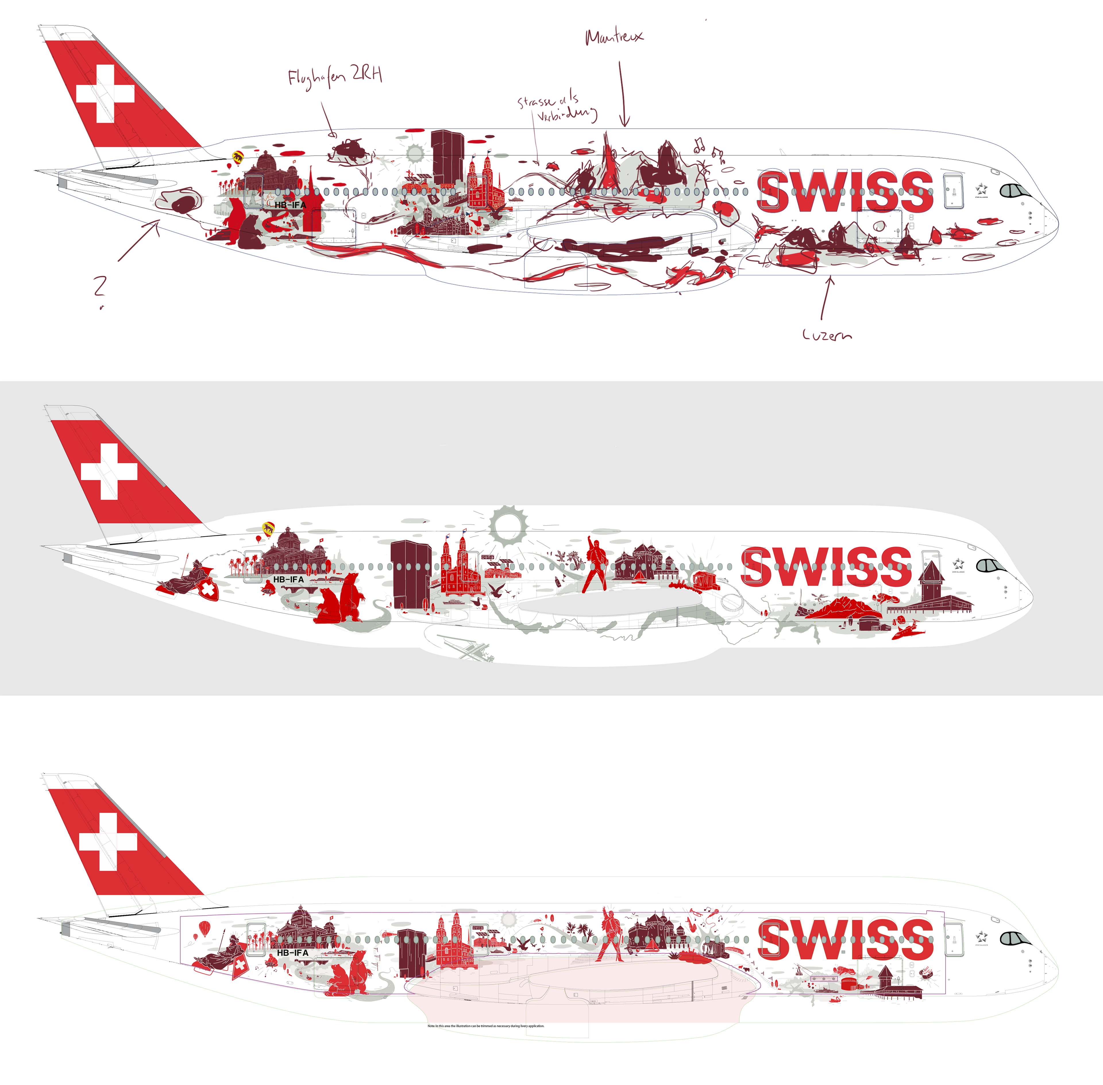 I had the amazing honor to design a special livery for the first of ten new Airbus A350 that will be flying for SWISS International Air Lines! The result is a visual treasure hunt through various Swiss cities and areas, blending imposing structures with further famous landmarks and motifs of traditional arts and sports events. Join the SWISS treasure hunt and win a flight with this new, truly unique plane!